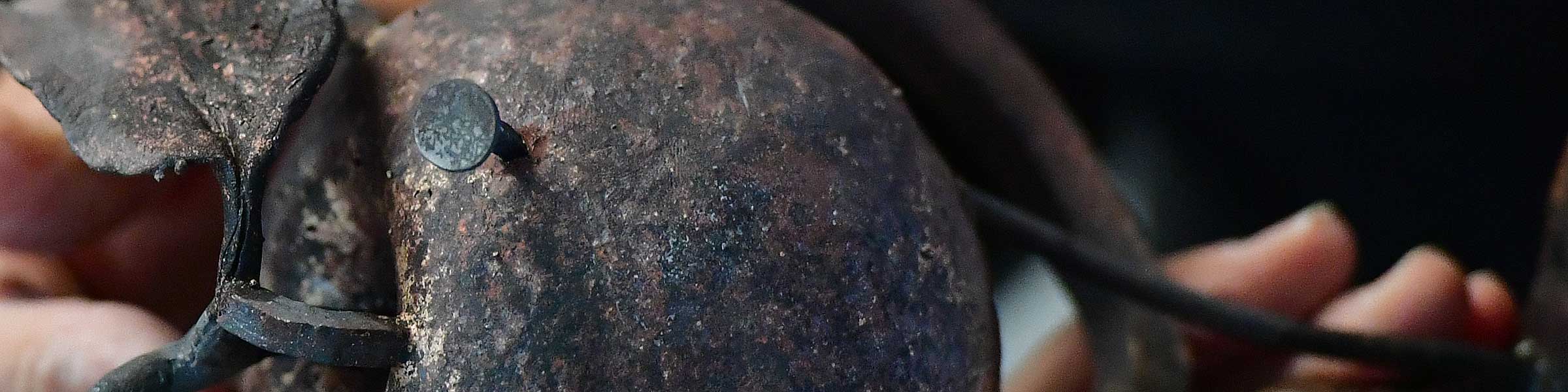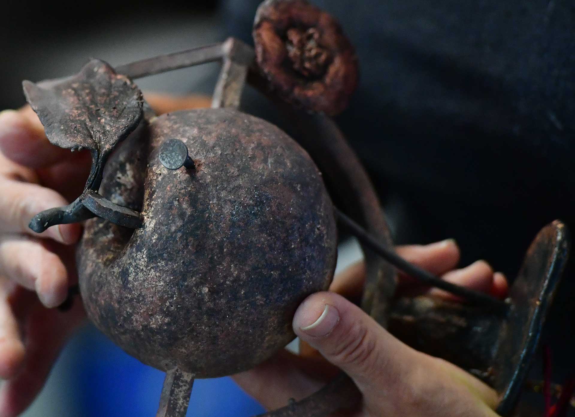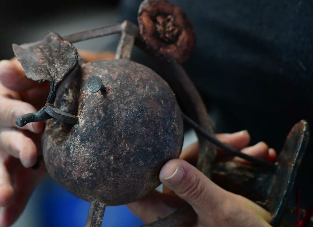 Ein Eisennagel steckt im Bronzeapfel.